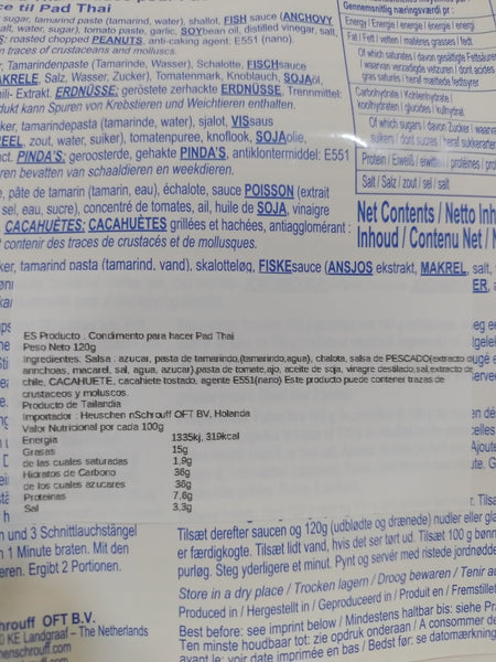 Ingredientes: Salsa : azucar, pasta de tamarindo,(tamarindo,agua), chalota, salsa de PESCADO(extracto de annchoas, macarel, sal, agua, azucar),pasta de tomate,ajo, aceite de soja, vinagre destilado,sal,extracto de chile, CACAHUETE, cacahiete tostado, agente E551(nano) Este producto puede contener trazas de crustaceos y moluscos.